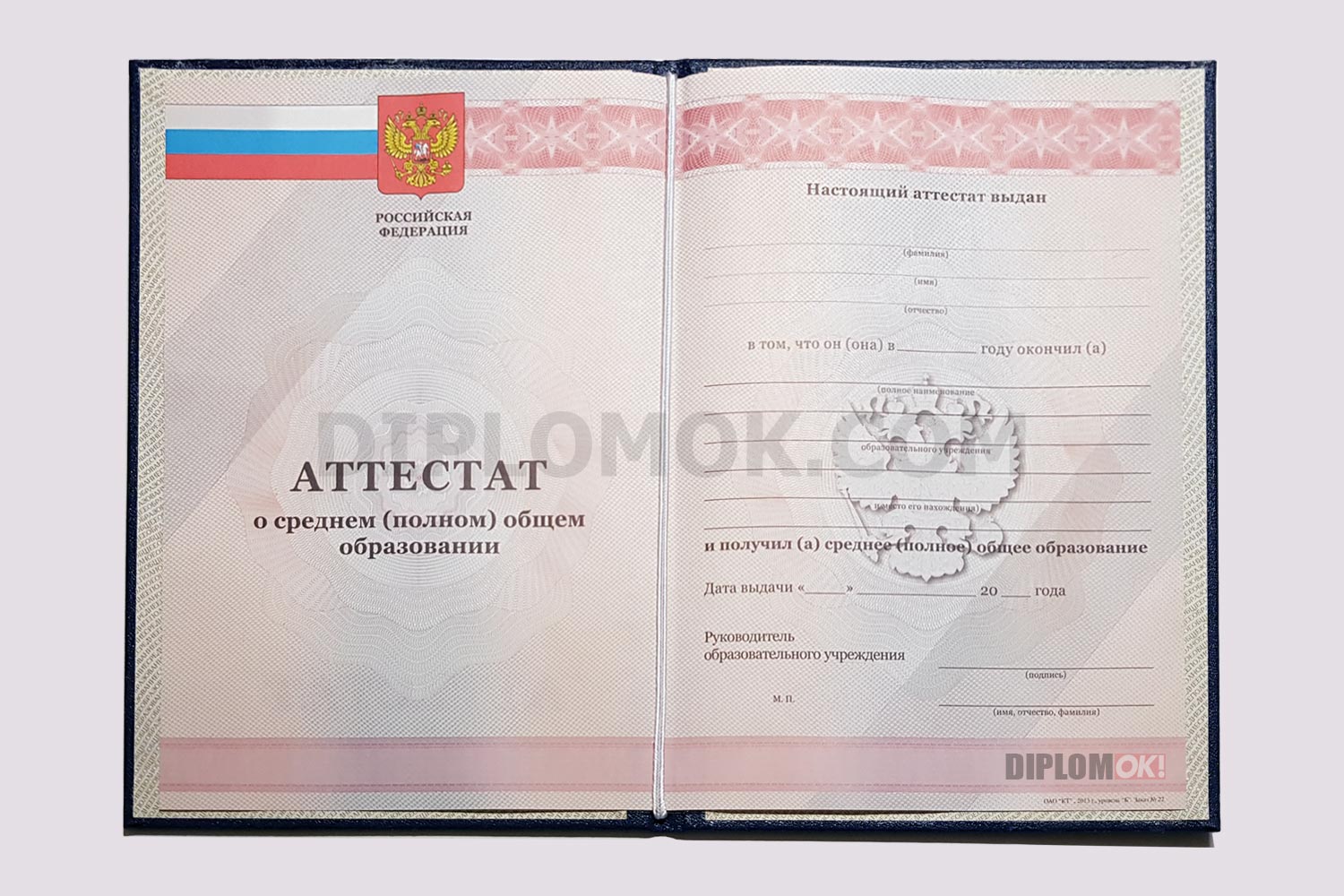 Аттестат о среднем общем образовании с окончанием школы в промежуток с 2010 по 2013 года. Все данные заносятся в соответствии со стандартами, установленными Минобрнауки. Заверяется документ круглой гербовой печатью выбранной школы и подписью директора.